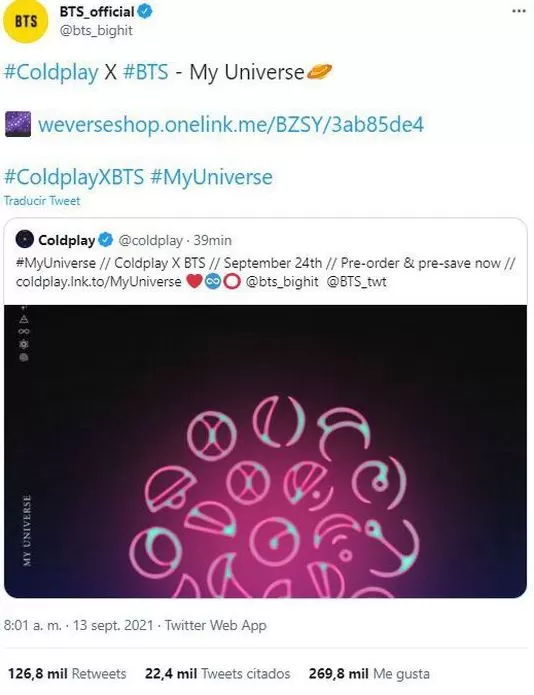 Gracias a la cuenta oficial que revela novedades sobre ‘Music of the Spheres’ el nuevo disco de Coldplay, se ha confirmado finalmente que, luego de múltiples filtraciones y rumores sobre una colaboración juntos, BTS y Coldplay tienen una canción juntos. El 13 de septiembre, el referido perfil compartió un video con código de caracteres en idioma ‘spheric’ que se asocia al planeta Epiphane. Estos conceptos fueron creados por la banda liderada por Chris Martin, con la temática de exploración sideral que engloba a su álbum.