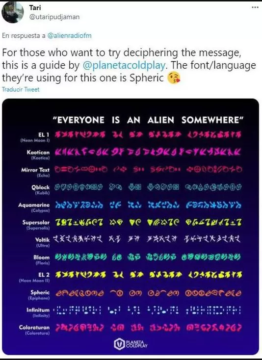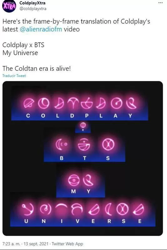 Pero como ya era de suponerse, sus más ávidos fans empezaron la decodificación de esos códigos,  difundiendo pistas para traducirlo, y rápidamente se dieron cuenta que, al cambiar los símbolos por letras del alfabeto, se puede leer la frase ‘Coldplay x BTS, My Universe’.