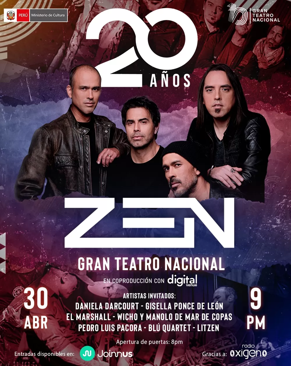 El grupo peruano ZEN cumple 20 años y se prepara para celebrarlo con un recital muy especial en el Gran Teatro Nacional. El concierto contará con varios artistas invitados entre los que se encuentran Daniela Darcourt, Gisella Ponce de León, El Marshall, Wicho y Manolo de Mar de Copas, Pedro Luis Pacora, Blú Quartet y más. Las entradas para este concierto de aniversario se encuentran disponibles, a través de Joinnus.
