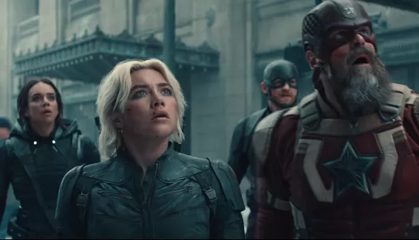 La segunda escena, en cambio, es de esas que te hacen agarrarte del asiento. Está ambientada catorce meses después del final de la película en la nueva base de operaciones del equipo y ellos siendo Los Nuevos Vengadores, lo cual les esta genrando problemas con Los Vengadores originales. En medio de una conversación cotidiana entre Yelena Belova y Bucky Barnes, una alerta interdimensional interrumpe todo. El momento es breve, pero explosivo: una nave está ingresando al universo principal y en su estructura se ve claramente un número gigante: el 4. Así es, ¡los Cuatro Fantásticos acaban de entrar oficialmente al Universo de Marvel!