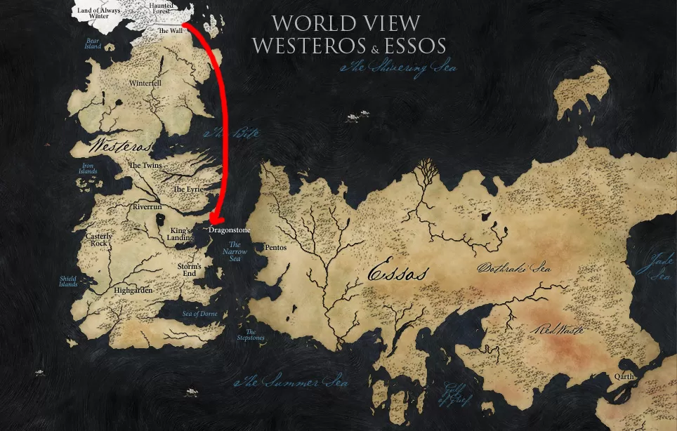 Pero eso no fue todo, porque un cuervo tiene que haberse prácticamente teletransportado hasta donde se encontraba Daenerys, que según el mapa de los Siete Reinos estaba a sus buenos cientos de kilómetros. Recordemos además que Sansa le dice a Brienne que el viaje hasta Desembarco del Rey "es largo" y tomando en cuenta que Invernalia está mucho más al sur que El Muro.... agrégale sus buenas horas más.