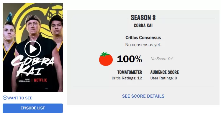 Y ahora que faltan pocos días y que algunos críticos ya han podido disfrutar de los nuevos episodios, el portal Rotten Tomatoes ha dado a conocer el score con el que debuta esta nueva temporada y es perfecto. En base a 12 reseñas por ahora, 'Cobra Kai - Temporada 3' logra un 100% de frescura.