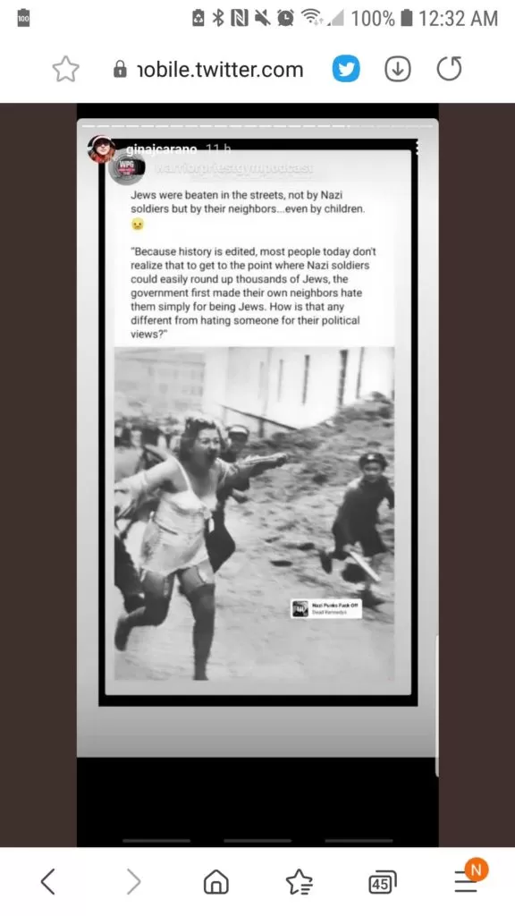 “Los judíos fueron golpeados en las calles no por los soldado Nazi sino por sus vecinos…incluso niños. ‘Porque la historia es editada, mucha gente el día de hoy no puede llegar al punto que los soldados Nazi pudieran arrestar a miles de judíos, el gobierno primero hizo que sus propios vecinos los odiaran solo por ser judíos. ¿Por qué aquello es diferente de odiar a alguien por sus puntos de vista políticos?”