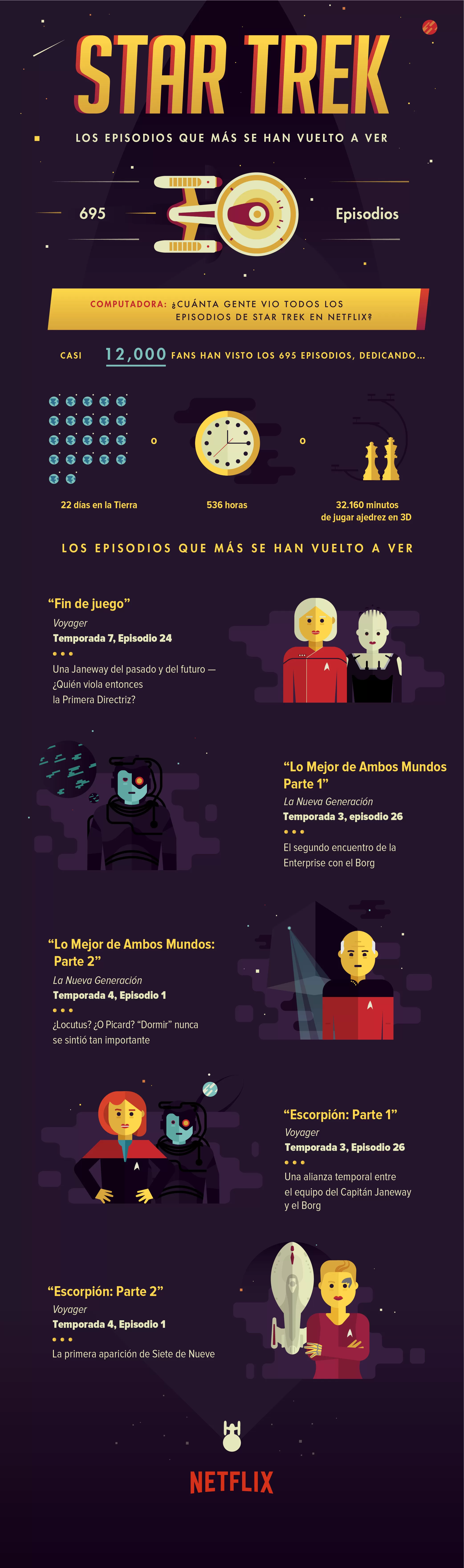 ¿Cuántos miembros han visto los 695 episodios de Star Trek en Netflix? Son más de 12 000 fans los que se han pasado más de 536 horas (o 22 días) viendo Star Trek. Los datos de Netflix también indican que el episodio que más veces se ha visto es "Fin del juego" (temporada 7, episodio 24) de Star Trek: Voyager.