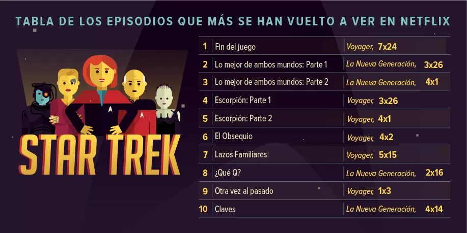 Como es de esperarse, los primeros episodios de una serie suelen ser los más vistos. Sin embargo, este análisis revela cuáles son los episodios que se ven una y otra vez. Los resultados indican que aquellos que más se vuelven a ver son donde se presentan a las razas icónicas, a personajes emblemáticos (Q, por ejemplo) o a capitanes memorables. Además, los fans de este clásico de la ciencia ficción dejan muy claro cuáles son los temas que más los enganchan al repetir los episodios: donde se muestran viajes en el tiempo, secuestros extraterrestres o un cruce de universos.