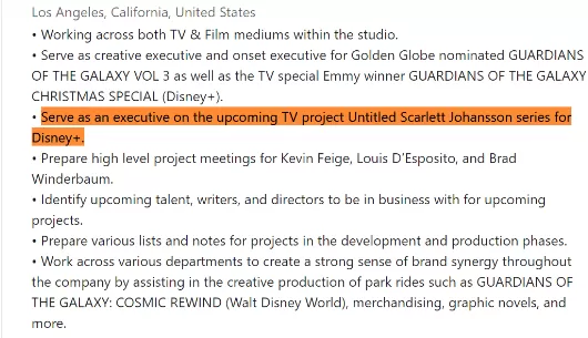 La ejecutiva creativa de Marvel Studios, Courtney Baker, actualizó su perfil de Linkedin y escribió entre sus créditos estar trabajando en un "próximo proyecto de televisión a modo de serie de Scarlett Johansson para Disney+".