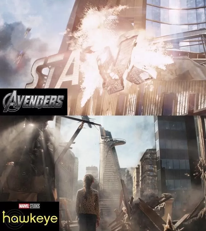 Y respecto a esta Batalla de Nueva York, otro error se coló en el episodio. ¿Te acuerdas cuando Loki está peleando con Thor y en el conflicto destruyen la letra K? Pues aquí te dejamos la imagen donde se ve clarito que la primera letra en caer es justamente la letra K. Sin embargo, cuando vemos a Kate Bishop asomarse por entre los escombros y ver la Torre Stark, la letra K permanece en su lugar.