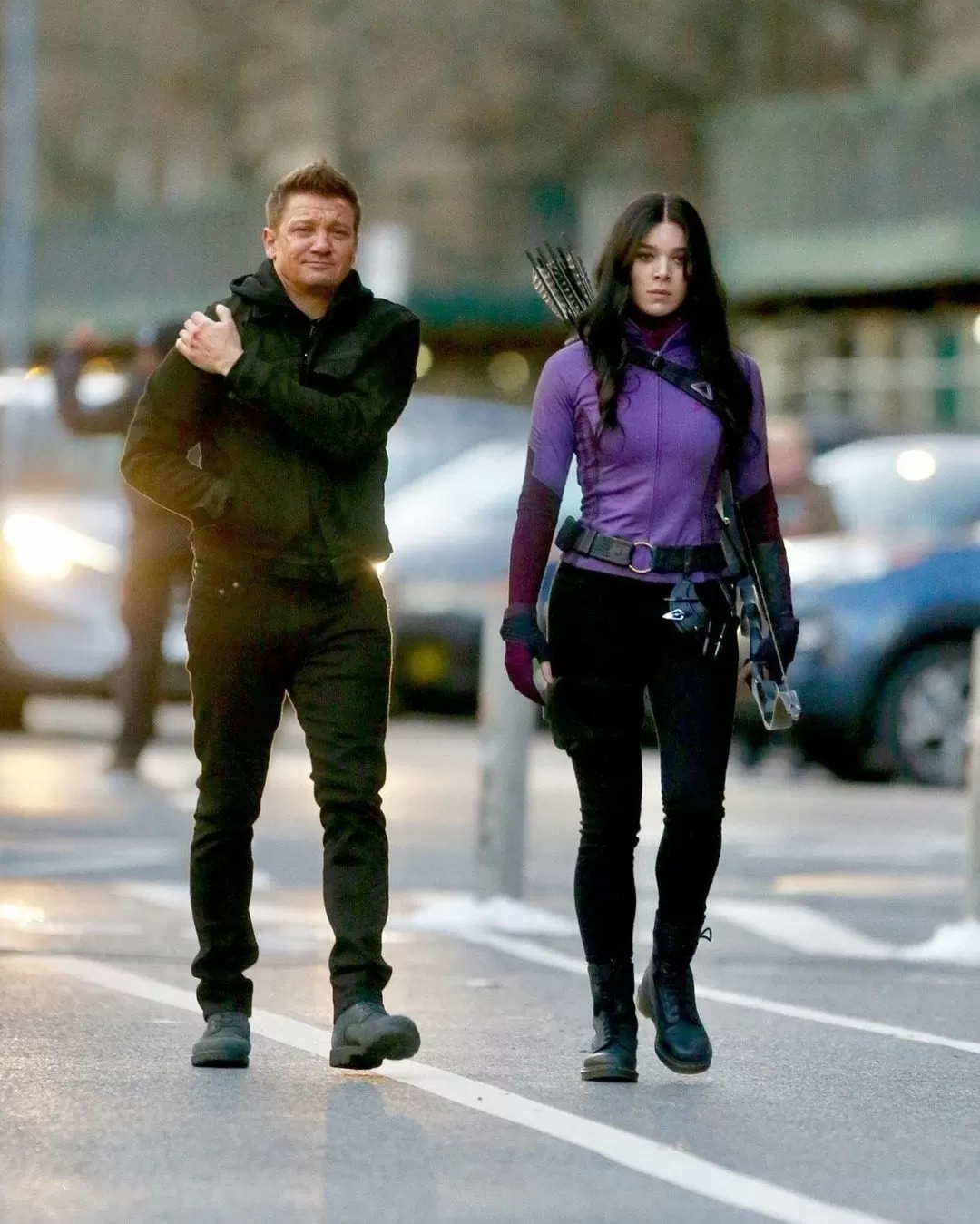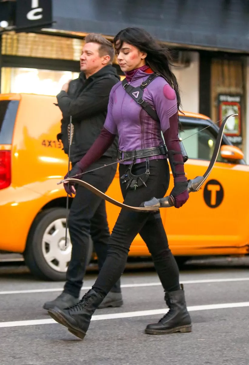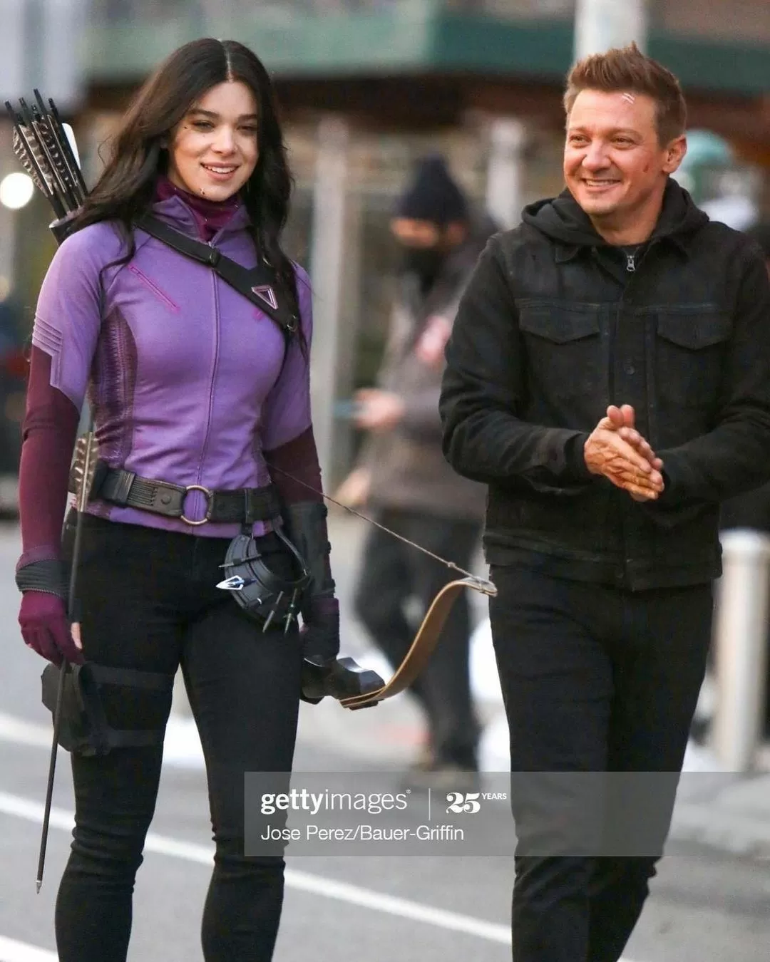 Los actores Jeremy Renner y Hailee Steinfeld se vistieron en el set como... bueno, digamos Hawkguy y Hawkeye, con Steinfeld en el tradicional traje púrpura de Kate Bishop y un arco y un carcaj al hombro: