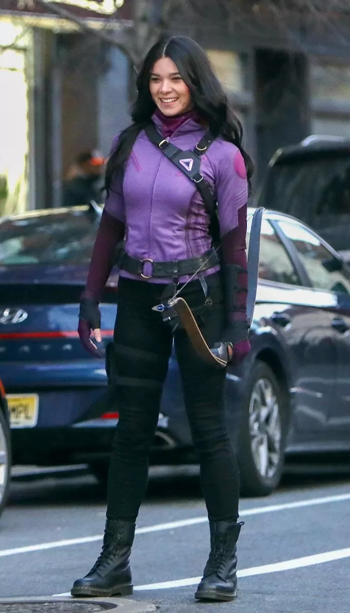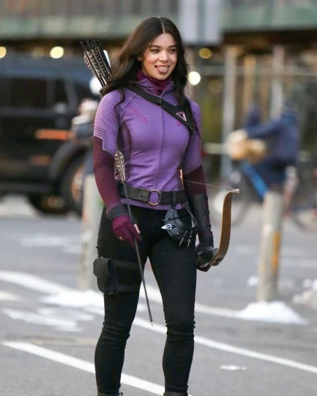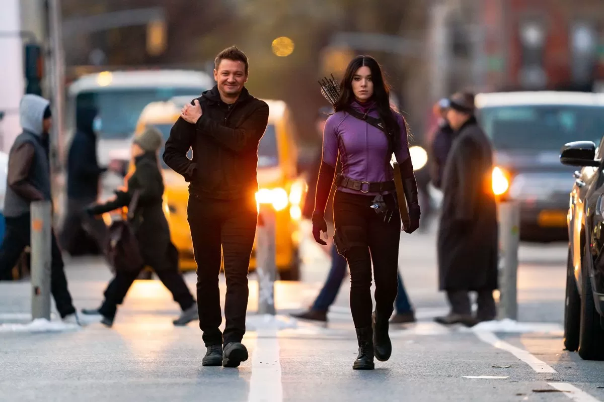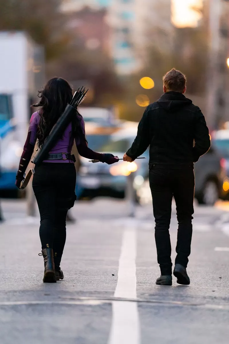 Los actores Jeremy Renner y Hailee Steinfeld se vistieron en el set como... bueno, digamos Hawkguy y Hawkeye, con Steinfeld en el tradicional traje púrpura de Kate Bishop y un arco y un carcaj al hombro: