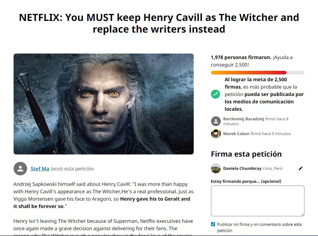 Algunos fans incluso fueron más allá y han hecho el pedido en Change.org donde dice: "NETFLIX: deben conservar a Henry Cavill como The Witcher y reemplazar a los escritores en su lugar".