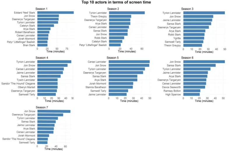 Tal cual lo habías sospechado, Jon Snow es el personaje con más tiempo en las pantallas de manera histórica en Juego de Tronos. A él le sigue Tyrion Lannister y en tercer lugar está Daenerys Targaryen.