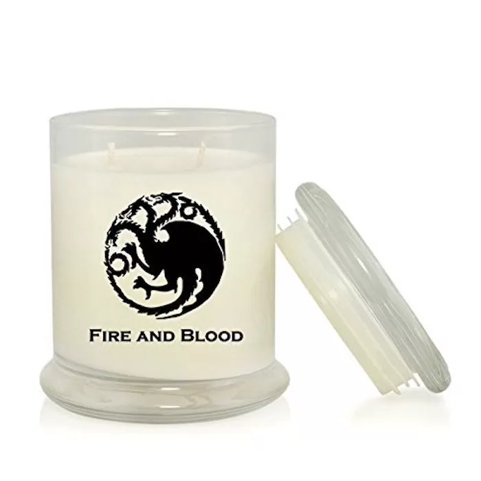 10. Vamos a encender totalmente esta Vela de la Casa Targaryen Madre de Dragones ($ 25) durante el próximo episodio.