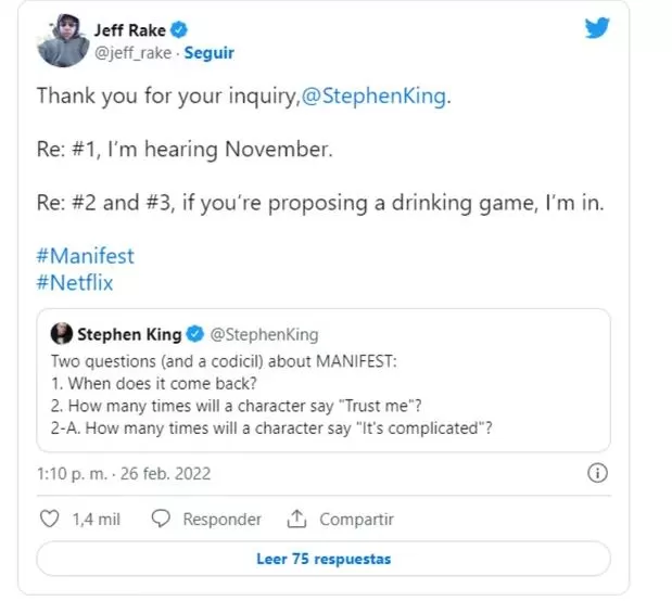 Según informó la fuente Deadline, la última parte contará con 20 episodios que serán presentados de forma separada y en distintos momentos. Hasta el momento no ha habido anuncios oficiales sobre una posible fecha de lanzamiento; sin embargo, nos han soltado una pista, y gracias a nadie menos que Stephen King, uno de sus más ávidos fanáticos, mencionando a Jeff Rake a través de Twitter y le consultó: 1″. ¿Cuándo vuelve? 2. ¿Cuántas veces dirá un personaje ‘confía en mí’? 2-A. ¿Cuántas veces dirá un personaje ‘es complicado’?”.