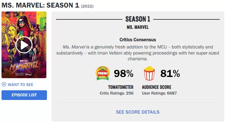 Ojo que con esta calificación, la serie sobre Kamala Khan no solo se pone por encima de todas las series que ha hecho Marvel para Disney+, incluida 'What If...?', que tiene una puntuación del 94 % y Agents of S.H.I.E.L.D. con 95%, sino también de todos los proyectos cinematográficos y ha superado, mucho ojo aquí, a 'Pantera Negra' que logró obtener un 96% de frescura en el portal (aunque con el doble de reseñas).