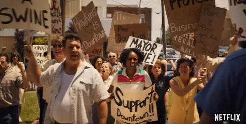 También presenta una secuencia en donde los habitantes protestan contra la creación del mall y a favor del downtown, el lugar central en donde se establecieron históricamente los negocios del pueblo.