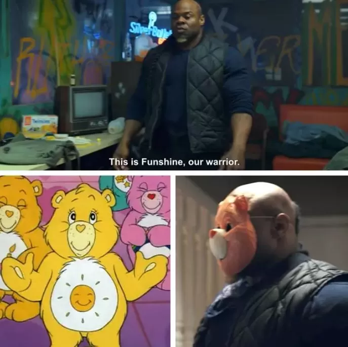 10. Uno de los miembros de la pandilla de Kali se llama Funshine, como el Osito Cariñosito Funshine, que es la máscara exacta que Ben Cooper usa para Halloween. Kali incluso dice: "No dejes que su tamaño te asuste. Es un oso de peluche”.