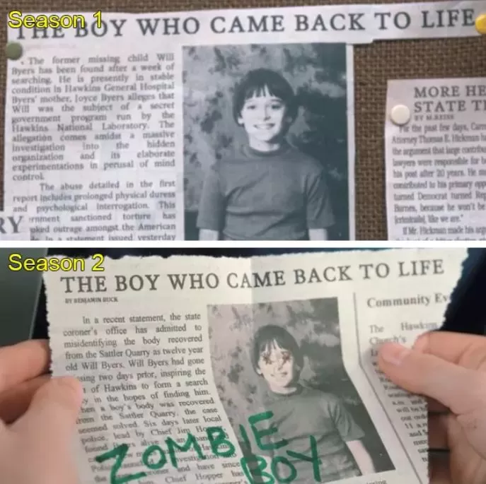 La temporada 1 dice: "El ex niño desaparecido Will Byers fue encontrado después de una semana de búsqueda. Actualmente se encuentra en condición estable en el Hospital General Hawkins. La madre de Byers, Joyce Byers alega que Will fue sujeto de un programa gubernamental secreto dirigido por el Laboratorio Nacional Hawkins. La acusación se produce en medio de una investigación masiva sobre la organización oculta y sus elaboradas experimentaciones en la observación del control mental".