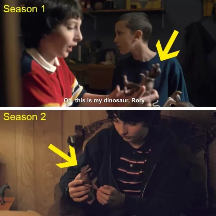 7. Cuando Mike tiene que elegir juguetes para la venta de garaje en la temporada 2, se queda con un dinosaurio, que es uno de los juguetes que le mostró por primera vez a Once en la temporada 1.