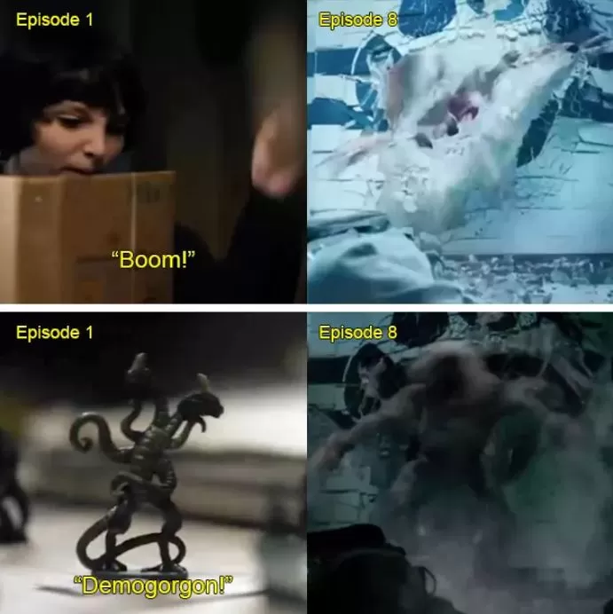 5. Hablando de la Temporada 1, la escena en la que los niños juegan Dungeons & Dragons en el primer episodio, se alinea escalofriantemente perfecto con la escena del Demogorgon en el Episodio 8.