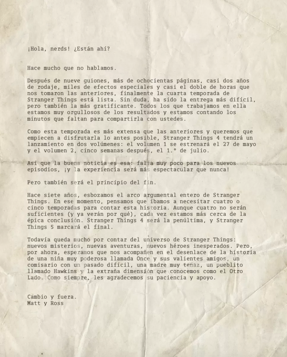 "Hace siete años, planeamos el arco argumental completo de Stranger Things. En ese momento, predijimos que la historia duraría de cuatro a cinco temporadas. Resultó demasiado grande para contarla en cuatro, pero, como pronto verán por ustedes mismos. - ahora nos precipitamos hacia nuestro final. La temporada 4 será la penúltima temporada; la temporada 5 será la última