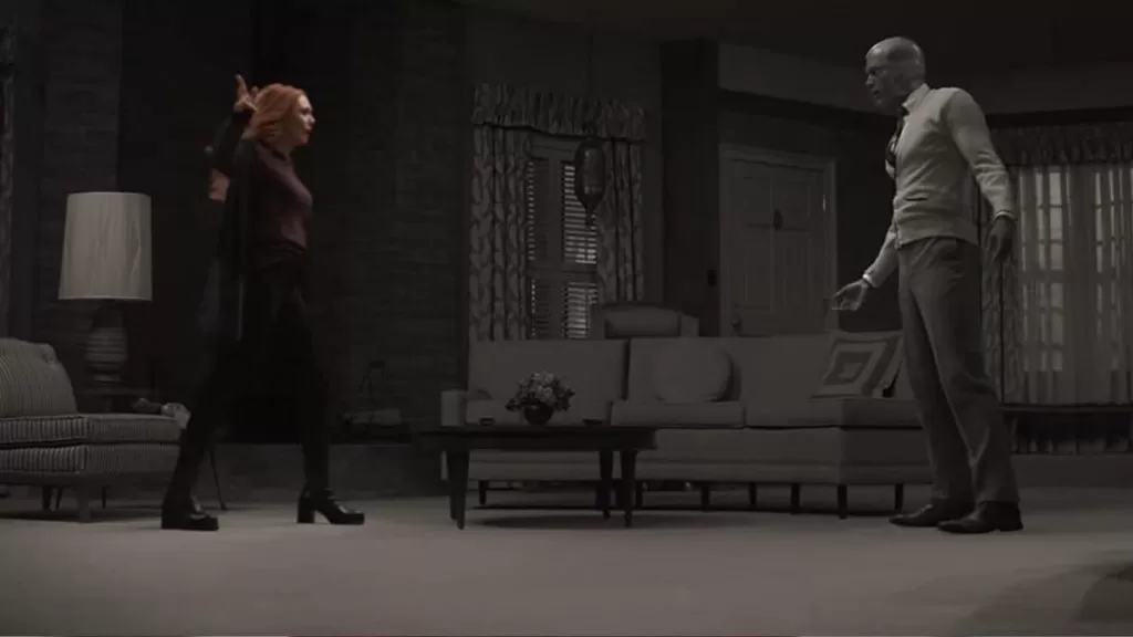 Wanda de pronto se detiene ante una propiedad y la vemos abrir un sobre que indica que aquel lugar había sido el elegido por Visión para que ambos tengan su propio nidito de amor. Impulsada por todo su dolor, Wanda construye su casa - inspirada en sus recuerdos de sitcom- desde los cimientos y a su vez no solo crea el Hexágono sino también a su propia versión de Visión.