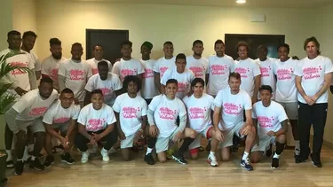 Previo a la partida del hotel donde el equipo está concentrado, los seleccionados peruanos se tomaron una foto grupal solidarizándose con la pequeña Valeria, que de solo tres meses ha perdido el 90 % del intestino delgado.