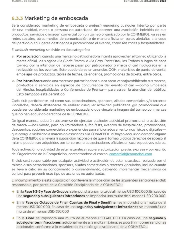 El artículo 6.3.3 está vinculado al denominado “Marketing de emboscada”. De acuerdo con la normativa, este punto regula "cualquier intento por parte de una entidad, marca o persona no autorizada de obtener una asociación indebida de sus productos, servicios o imagen comercial con un torneo organizado por la CONMEBOL". En caso de comprobarse la infracción, la sanción económica es elevada. "En la Fase 1-2-3 y Fase de Grupos: se impondrá una multa de al menos USD 100.000".