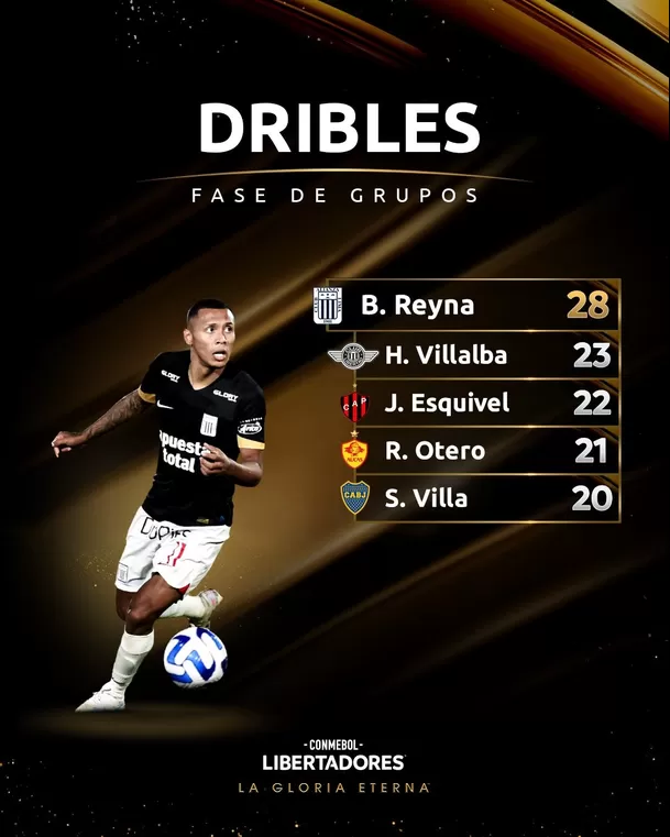 "Bryan Reyna, de Alianza Lima, el jugador más dribles en la Conmebol Libertadores 2023", señala el mensaje junto a la gráfica de Reyna y su gran estadística.