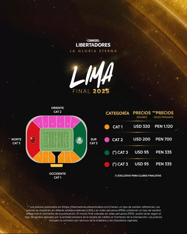 La Conmebol anunció oficialmente la venta de entradas para la final de la Copa Libertadores 2025, que se disputará el sábado 29 de noviembre a las 5:00 p.m. en el Estadio Monumental U de Ate. Lima volverá a convertirse en el epicentro del fútbol sudamericano con el esperado duelo entre Flamengo y Palmeiras, dos gigantes de Brasil que prometen un espectáculo de primer nivel.