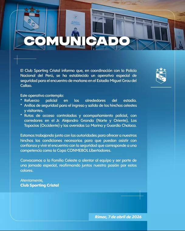 “El Club Sporting Cristal informa que, en coordinación con la Policía Nacional del Perú, se ha establecido un operativo especial de seguridad para el encuentro de mañana en el Estadio Miguel Grau del Callao”, se lee en el documento.