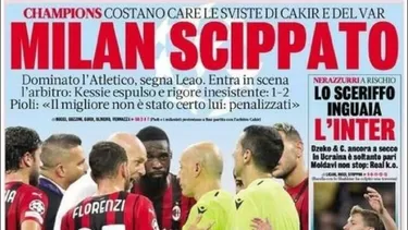 "Robo al Milan", es el titular de "La Gazzetta dello Sport", que considera injusto el penalti concedido al Atlético por un toque con la mano del francés Pierre Kalulu en el área, transformado a continuación por el uruguayo Luis Suárez, y que también cuestiona la segunda amarilla mostrada al marfileño Frank Kessie.