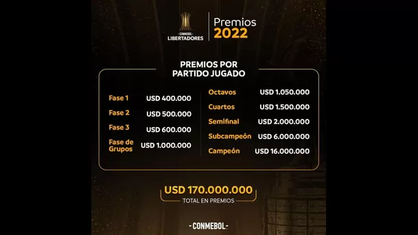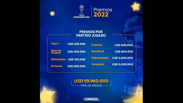 Del mismo modo, en la Sudamericana la Conmebol ofrece premios que superan los 59 mil millones dólares desde la Fase 1 hasta el equipo que levante el trofeo.