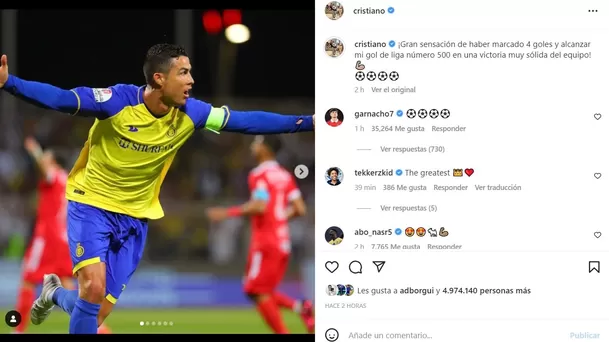 "Una gran sensación haber marcado 4 goles y alcanzar mi gol 500 en ligas en una victoria muy sólida del equipo", celebró 'CR7' en sus redes sociales, refiriéndose a sus goles en los campeonatos de Portugal, España, Inglaterra, Italia y Arabia Saudita.