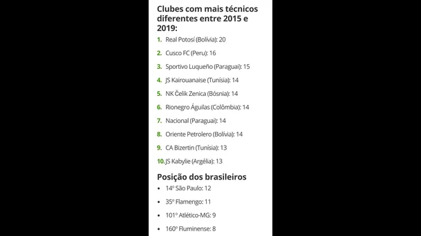 En lo que respecta a las ligas que más cambios de entrenadores hizo, la clasificación la encabeza Bolivia, seguido de Túnez y Argelia. Perú aparece recién en el puesto 15.