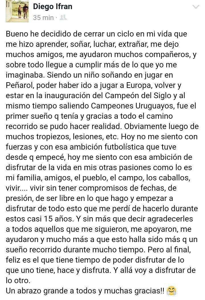 "He decidido cerrar un ciclo en mi vida que me hizo aprender, soñar, luchar, extrañar, me dejó muchos amigos y sobretodo cumplir lo que imaginaba. Siendo un niño soñé con jugar en Peñarol y Europa, salir campeón en Uruguay y gracias a todo el camino recorrido se pudo hacer realidad. Obviamente hubo tropiezos, lesiones, etc. Hoy no me siento con fuerzas y con esa ambición futbolística que tuve desde que empecé, hoy me siento con esa ambición de disfrutar la vida en mis otras pasiones como lo es la familia, amigos, el pueblo, el campo, los caballos, vivir sin tener compromisos de fechas, de presión y empezar a disfrutar de todo lo que me perdí durante estos casi 15 años. Agradezco a todos los que me apoyaron y ayudaron. Al final feliz de poder disfrutar de lo que uno tiene, hace y disfruta. Un abrazo a todos y muchas gracias", escribió Ifran en su cuenta de Facebook.