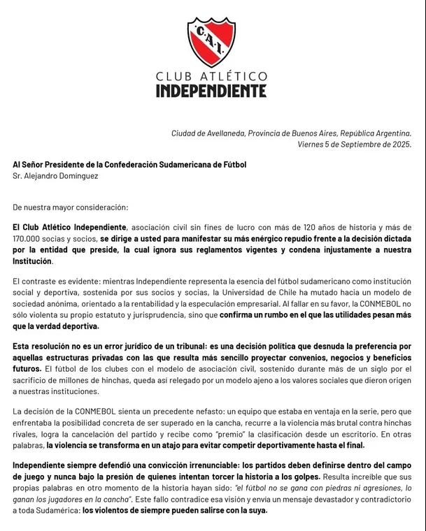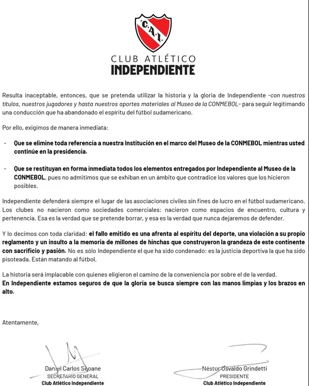 Además, exigieron que se elimine toda referencia a la institución en el Museo de la Conmebol mientras Domínguez continúe en la presidencia y reclamaron la devolución inmediata de los elementos entregados por Independiente a dicha entidad.