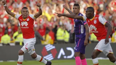 El defensor del Medellín Andrés Mosquera marcó de cabeza en su propia portería al tratar de despejar un tiro libre ejecutado por el 10 del Santa Fe, el argentino Omar Pérez.