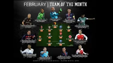 El equipo ideal de Europa lo conforman los siguientes jugadores: en el arco Heurelho da Silva Gomes (Watford FC); en la defensa Ignazio Abate (Milan), Virgilio van Dijk (Southampton), Thiago Silva (PSG) y Juan Vargas (Real Betis); en la volante Lionel Messi (Barcelona), Corentin Tolisso (Olympique de Lyon), Mesut Özil (Arsenal) y Nicolas de Préville (Stade Reims); y en el ataque ubican a Zltan Ibrahimovic (PSG) y Luis Suárez (Barcelona).