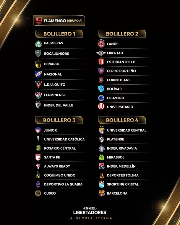 Otra posibilidad podría ser un grupo encabezado por Flamengo, acompañado por Universitario, Universidad Católica de Chile y Deportes Tolima. En este tipo de combinaciones, la pelea por el segundo lugar del grupo suele ser el objetivo principal para los equipos fuera del favoritismo.