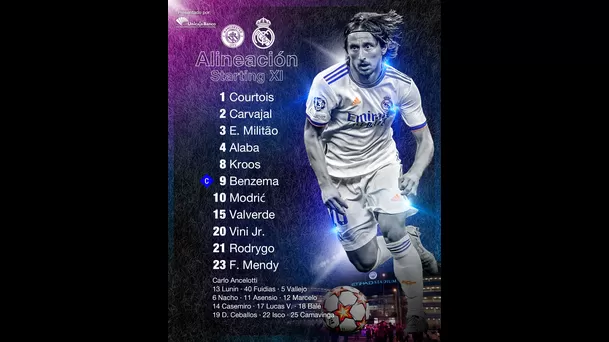 De cara al encuentro, el entrenador italiano Carlo Ancelotti presentará el siguiente once: Courtois, Dani Carvajal, Éder Militão, David Alaba, Ferland Mendy, Luka Modric, Toni Kroos, Federico Valverde, Rodrygo, Karim Benzema y Vinicius Junior.
