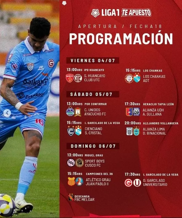 El domingo 6 de julio se disputarán Sport Boys vs. Cusco FC (1:00 p.m.), Atlético Grau vs. Juan Pablo II (3:15 p.m.) y Deportivo Garcilaso vs. Universitario (5:30 p.m.). En esta fecha, Melgar descansará.