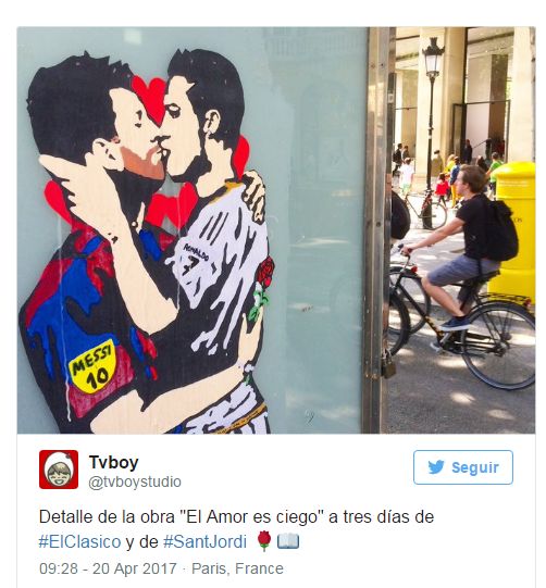 Aprovechando la coincidencia del partido entre los dos históricos del fútbol español con el 23 de abril, día de los enamorados en la región de Cataluña, el artista callejero Tvboy decidió lanzar un mensaje de amor con esta obra en una marquesina de autobús en pleno centro de Barcelona.