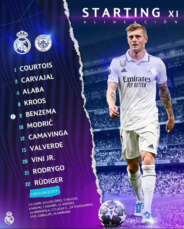 Real Madrid: Courtois, Carvajal, Rüdiger, Alaba, Camavinga, Valverde, Kroos, Modric, Rodrygo, Benzema y Vinicius. Entrenador: Carlo Ancelotti (ITA)