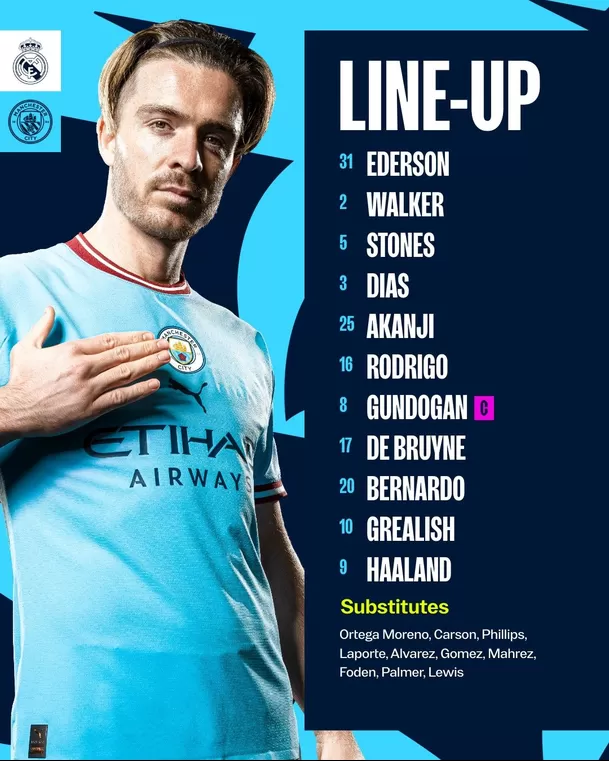 Manchester City: Ederson, Walker, R. Dias, Akanji, Stones, Rodri, B. Silva, De Bruyne, Gündogan, Grealish y Haaland. Entrenador: Pep Guardiola (ESP)