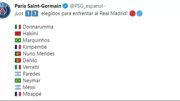 París Saint-Germain: Donnarumma - Achraf, Marquinhos, Kimpembe, Nuno Mendes - Verratti, Paredes, Danilo - Neymar, Messi, Mbappé.