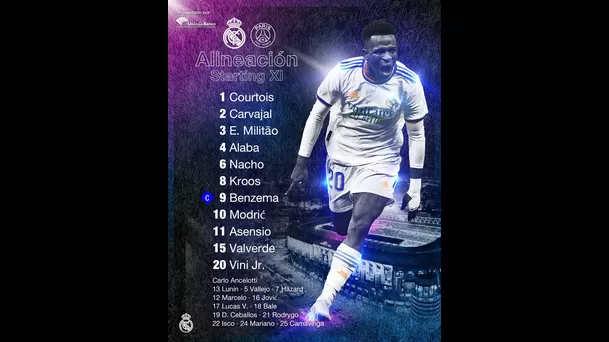 Real Madrid: Courtois - Carvajal, Militao, Alaba, Nacho - Kroos, Valverde, Modric - Asensio, Vinicius, Benzema.