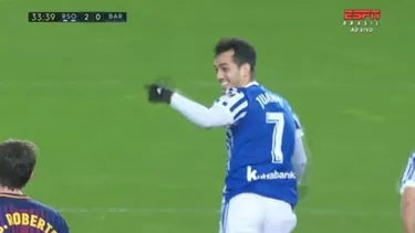 El delantero de la Real Sociedad, en medio de los centrales del Barcelona, ganó la posición en el área y de media vuelta remató cruzado para vencer a Ter Stegen.