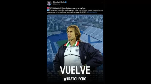 "CONFIRMADO. Ricardo Gareca vuelve a Vélez", publicó el hombre de prensa en su cuenta de Twitter.