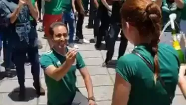 Conmovido por el triunfo de México sobre Alemania, el hincha José Saldívar le pidió hoy matrimonio a su novia Paulina Hernández al pie del monumento al Ángel de la Independencia en el festejo por el triunfo en el Mundial de Rusia 2018.
