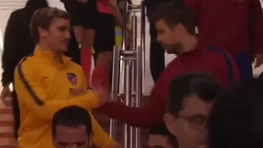 El jugador del FC Barcelona le pasó la voz al futbolista del Atlético y éste le respondió el saludo con una sonrisa y un abrazo. Piqué le dice algo y el francés volvió a sonreír.